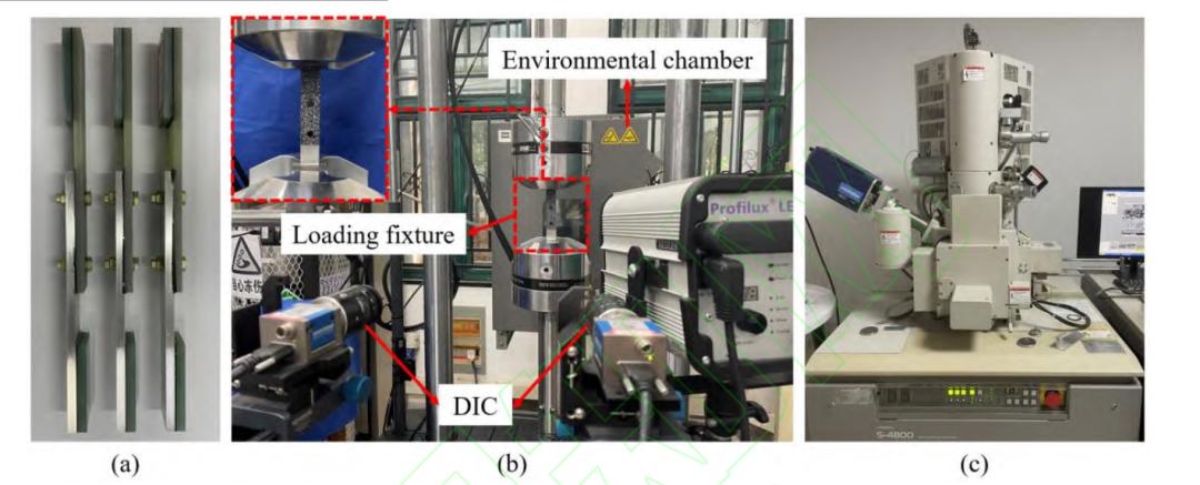 图4 试验及表征试验及表征设备:(a)试样图片;(b)试验装置与夹其;(c)扫描电镜设备
