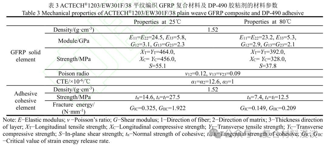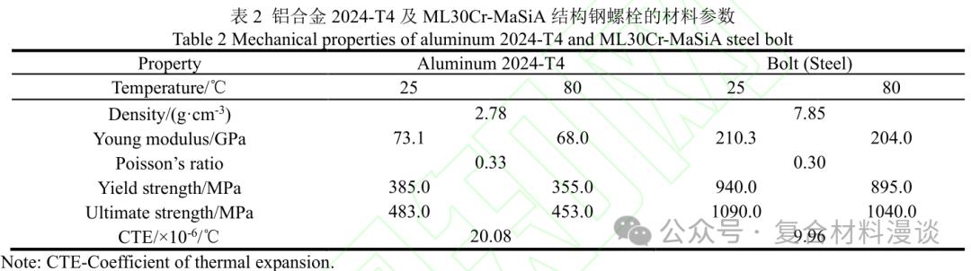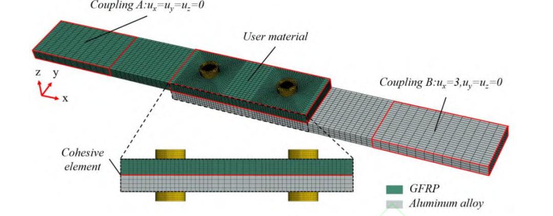 本文使用的金属材料具体参数如表 2 所示。其中金属材料的热膨胀系数及后续复合材料的热膨胀系数都使用 TMA 热机械分析仪测得。如图 5 所示,复合材料连接件模型中,对螺栓孔周区域进行了网格细化,将其和金属接触的区域采用用户自定义材料属性,其它区域均匀划分网格,材料属性赋予常规工程参量,单元类型采用三维实体缩减积分单元(C3D8R)。此外,对于胶螺混合连接结构模型,在两板接触区域插入厚度为 0.2mm 的内聚力单元(COH3D8)用于对胶粘剂的模拟。层合板渐进损伤及失效行为通过编写 VUMAT 子程序来实现,各单元材料无损状态下 的 参 数 见 表 3。