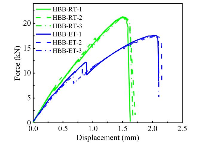 扩展到一定程度后右侧自由端边缘开始发生失效,最后逐渐向两螺栓之间演化。但 HBB-RT 试样两端边缘的胶粘剂开始失效时都导致了载荷-位移曲线的掉载,而 HBB-ET 试样中胶粘剂失效开始只导致曲线斜率小幅度的下降,直到胶粘剂完全失效时才发生一次较大幅度掉载,是高温环境中胶粘剂强度下降、承担的载荷减小所导致。且相比常温环境,高温环境下胶粘剂完全失效时的载荷下降近一半,也说明胶粘剂力学性能退化严重。