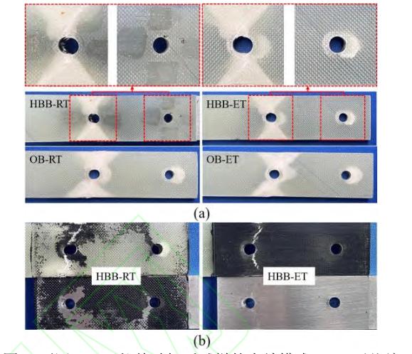 不同工况下试样拉伸破坏后的失效模式如图8 所示。对于试样结构中的金属连接件,并未出现明显的永久塑性变形。对于复合材料连接件,如图 8(a)所示,HBB-ET 的失效模式与 OB-RT 和OB-ET 相同,都为 Bl 螺栓孔两侧发生扇形区域的静截面拉伸破坏,以及 B1、B2 螺栓右侧由于轴承作用发生的挤压破坏;HBB-RT 试样只发生了Bl螺栓孔两侧发生扇形区域的静截面拉伸破坏,无明显挤压破坏,且拉伸破坏面积小于高温时。说明常温环境下,胶螺混合连接明显缓解了轴承作用导致的挤压破坏,但高温环境下,胶螺混合连接由于粘合剂性能的退化,失效模式与纯螺栓连接一致。