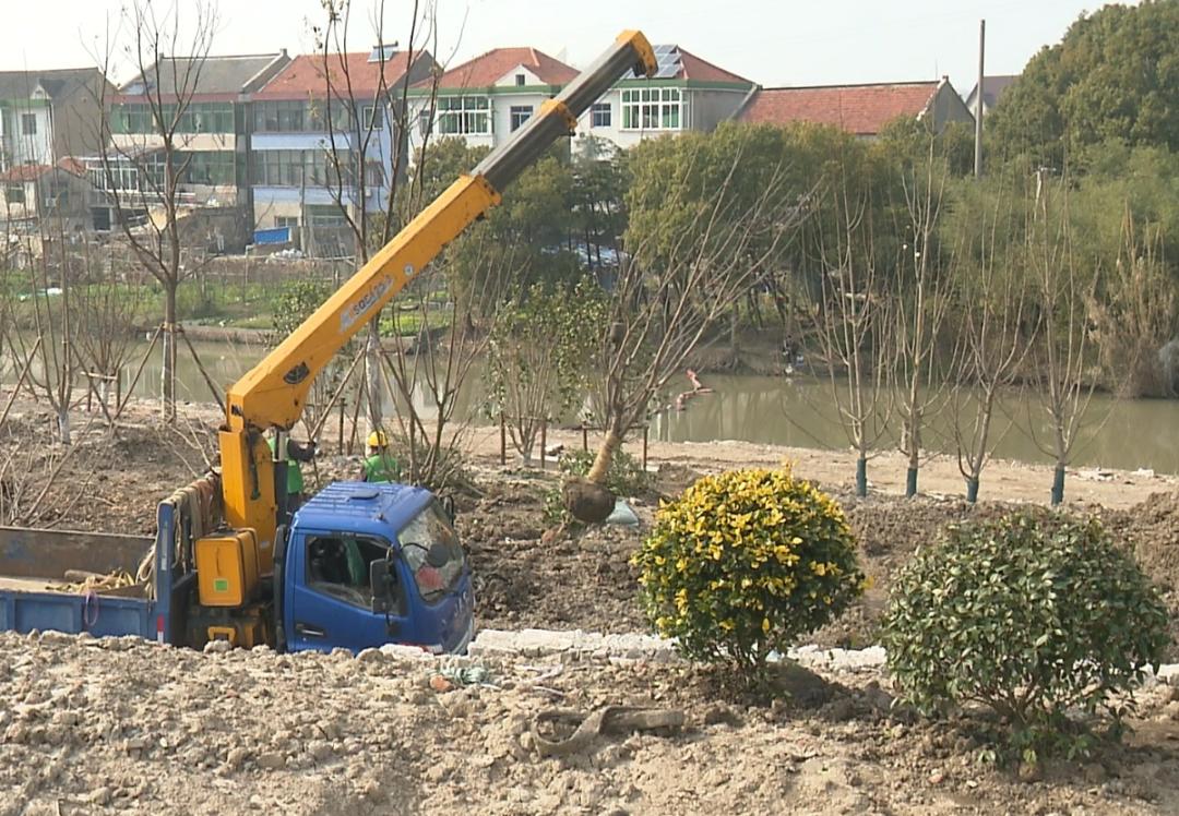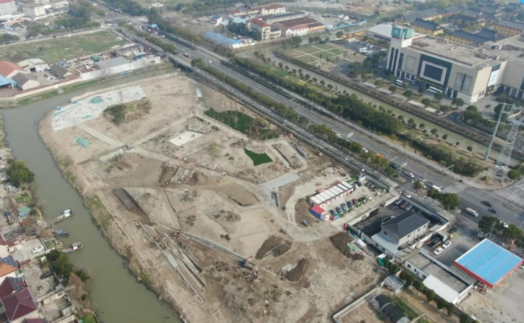 在金山大道金卫城河公共绿地新建工程项目现场,记者看到施工人员们正在忙碌,挖机在挖坑填土,工人们在移栽树苗,远处还有工人在修筑围墙。从空中航拍画面也可以看到,园内各项建设正在有序推进,部分区域绿植已经移栽种好。