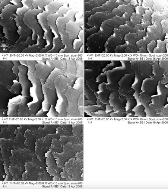 如果对比 CDE 的图片,可以看出随着温度的升高,角质层表面的鳞片裂隙和孔洞越来越多。并且,在 95 摄氏度处理的时候,角质层的最外侧出现了穿孔。