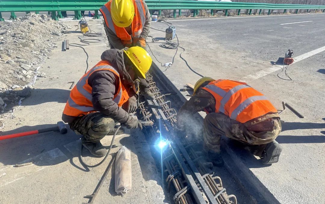 与此同时,在长太高速七工区标段施工现场,工人们正在进行伸缩缝安装施工。沟槽里,钢筋托架已经安装好,他们戴着手套、面罩和护目镜,全副武装,认真焊接每一条焊缝。