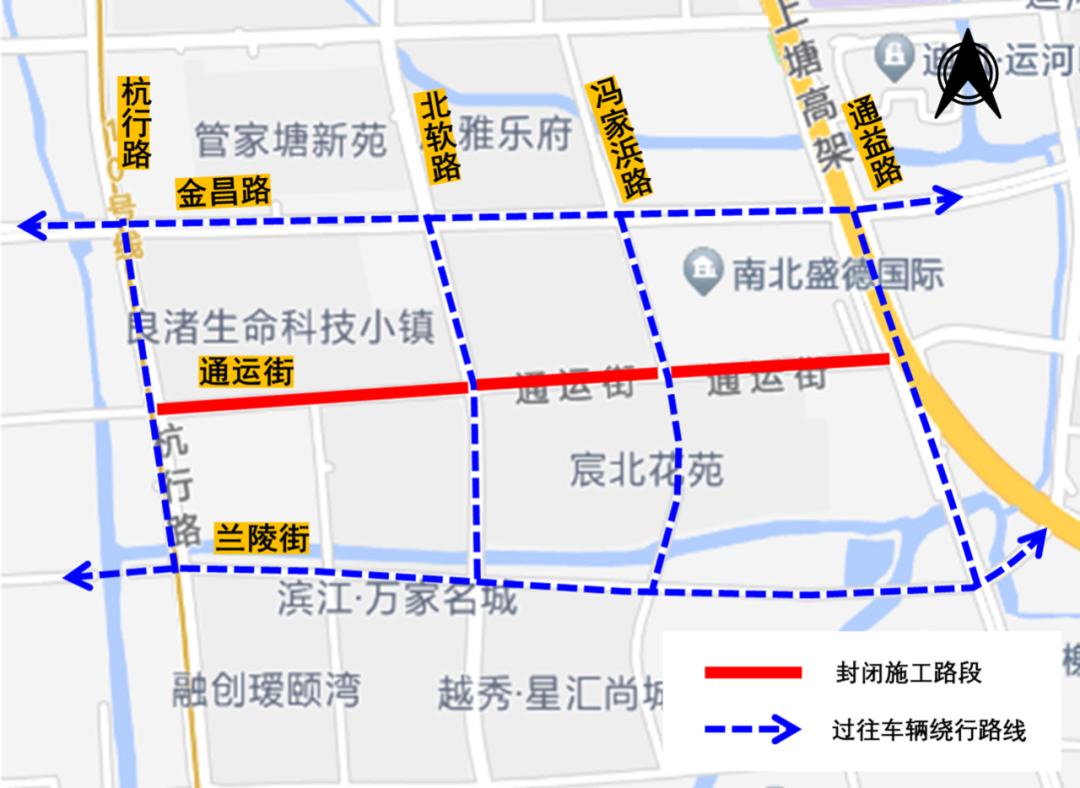 自3月10日起至8月10日,通运街(杭行路-通益路)段全封闭施工,施工期间,禁止一切机动车通行,过往机动车通过金昌路、兰陵街、北软路等道路通行;行人及非机动车可正常通行。