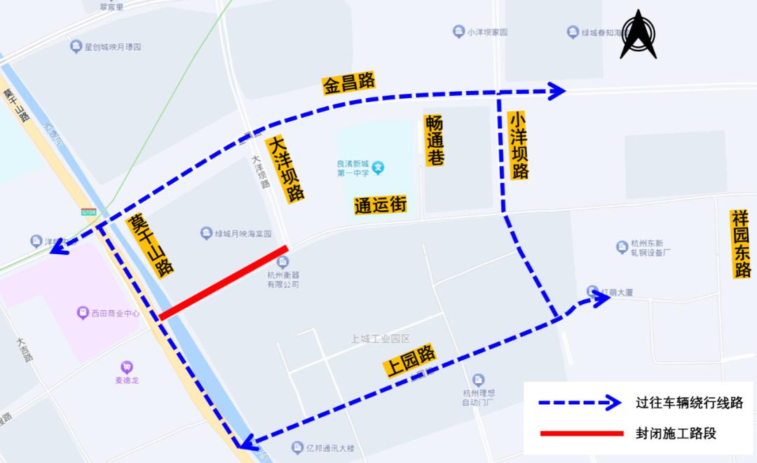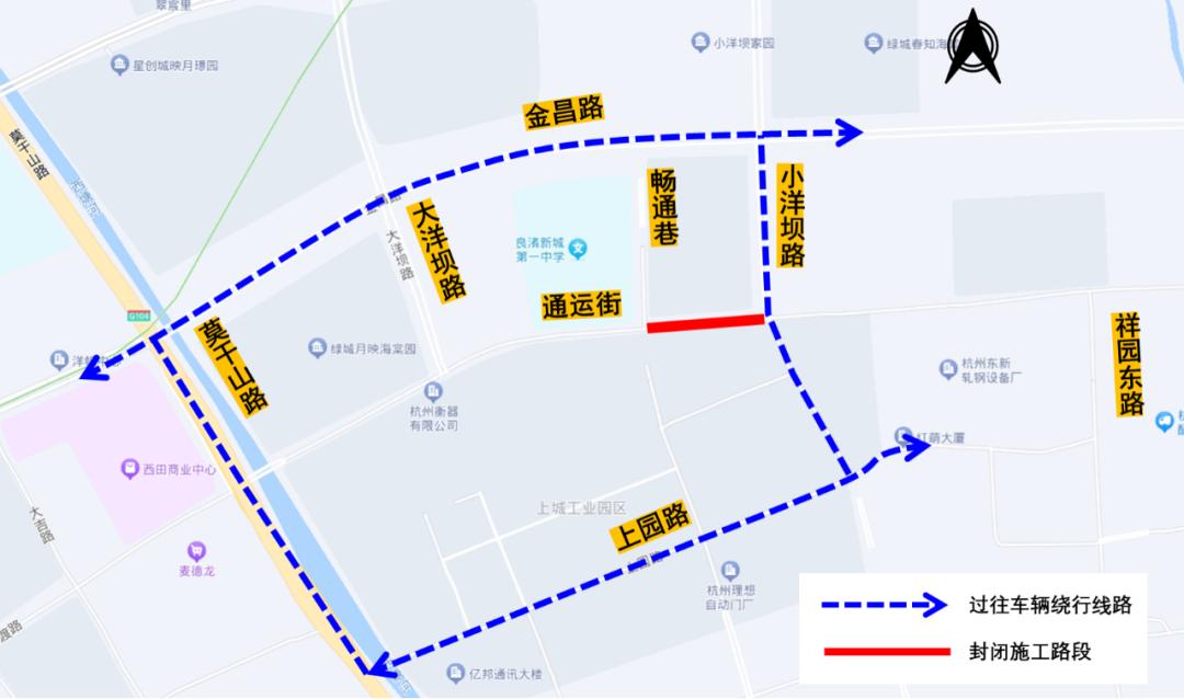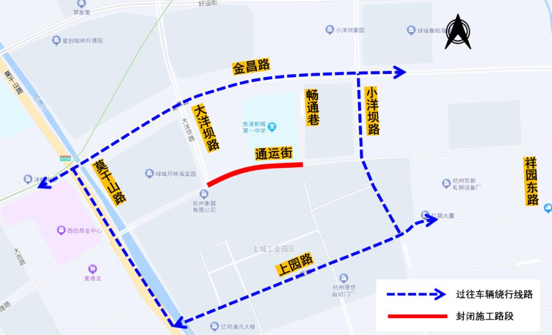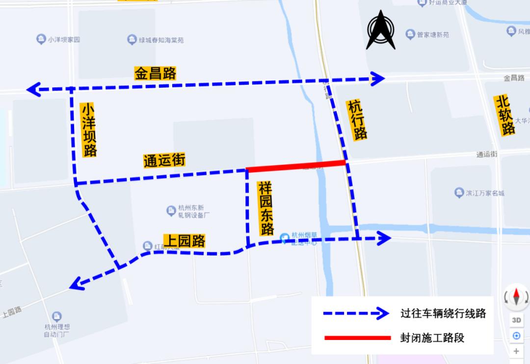 自2025年4月16日起至2025年6月30日,通运街(祥园东路-杭行路)段全封闭施工,禁止一切车辆及行人通行,过往车辆及行人通过金昌路、上园路、小洋坝路等道路通行。