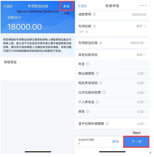 If you need to add an item for special additional deduction, you can click [Add] in the upper right corner, enter the information collection page of additional deduction and fill in it. If you have carefully checked the reported comprehensive income, expenses, tax-free income, donations, and other deduction items, please click [Next].