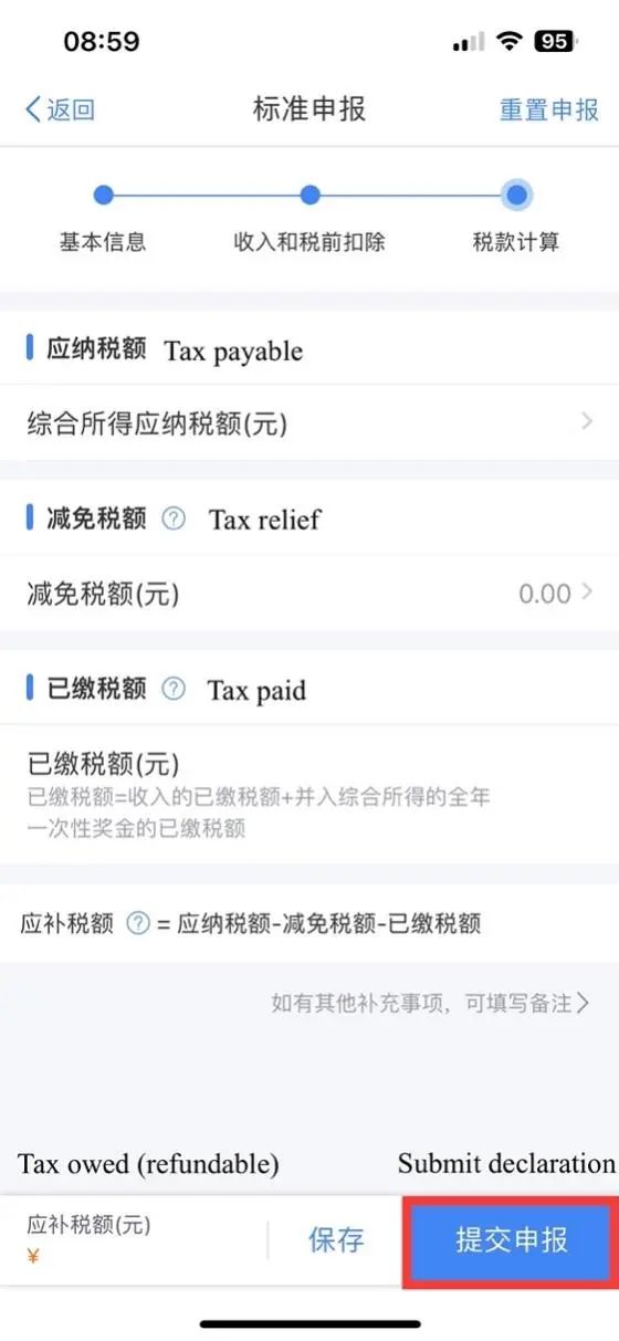 Check your tax payable, tax relief, tax paid and confirm your tax owed (refundable) at the bottom of the page. After the confirmation, click [Submit declaration] to complete the declaration