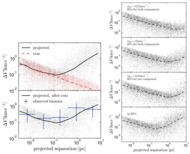 但是,当利用宽距双星来检验引力理论时,如果使用投影间距则会出现显著的统计偏差,尤其是当双星没有视向速度且投影间距较大时。2019年,当时正在加州大学伯克利分校攻读博士学位的El-Badry Kareem[11]通过计算机模拟出宽距双星的投影效应对两颗子星相对速度(∆V)的影响,如图2(左)所示。如果双星没有视向速度、仅有二维的自行(垂直视向速度的另外两个运动分量),当双星投影间距大于0.1 pc(秒差距pc是天文学中另外一个常用的距离单位,1 pc大约为3.26光年)时,受到投影效应影响后的∆V(黑色曲线为理论计算值,蓝色为实际测量值)开始严重偏离真值(红色虚线)。