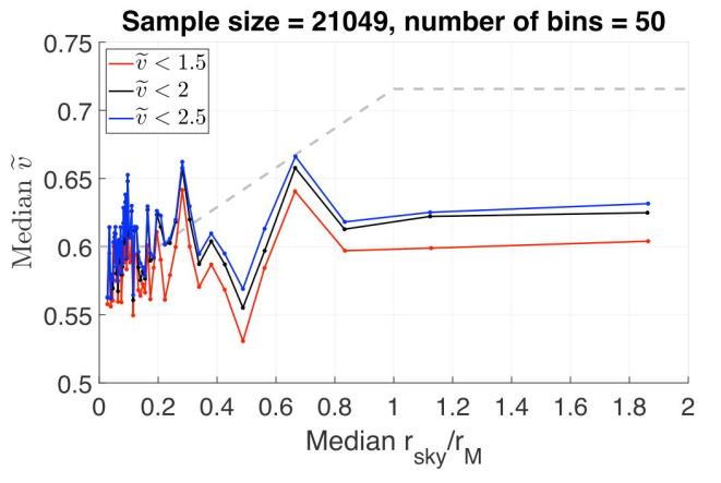图4. 英国圣安德鲁斯大学赵红胜教授领导的团队将韩国世宗大学Kyu-Hyun Chae教授所使用的数据进一步提炼后,采用自己的统计方法得到的结果。图像中,纵坐标由公式(3)定义,横坐标rM由公式(2)定义,rsky即本文中的sp,很显然观测数据曲线(不同颜色的实线)在间距大于rM时,并不符合MOND理论的预言(虚线)。