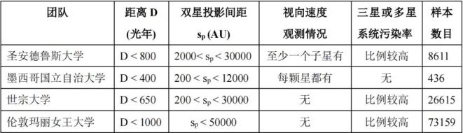表1. 2023年,不同团队挑选的宽距双星样本情况