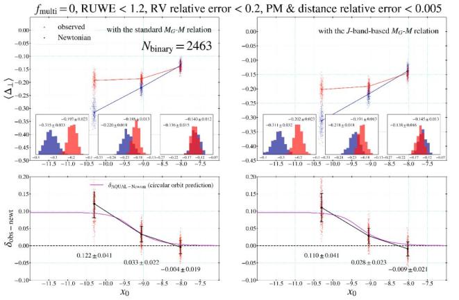 图5. 2024年,韩国世宗大学Chae教授在其2023年样本[21]的基础上进一步提高样本的质量,控制三星或多星系统的污染率为0(即fmulti = 0),我们可以清晰地看出双星间的加速度x0在大约10-8.0 cm/s2(MOND理论的临界加速度,参见公式1)时,双星间相对速度(∆V)的平均值完美地符合牛顿引力理论的预言(如上图所示);当双星间的加速度小于临界加速度时,双星间相对速度的观测值与牛顿引力理论预言值的差异δobs-newt与AQUAL模型[28](一种MOND理论)预言高度一致(如下图所示)。左右子图类似,只是质光关系略有差异,质量估算时有些差异。