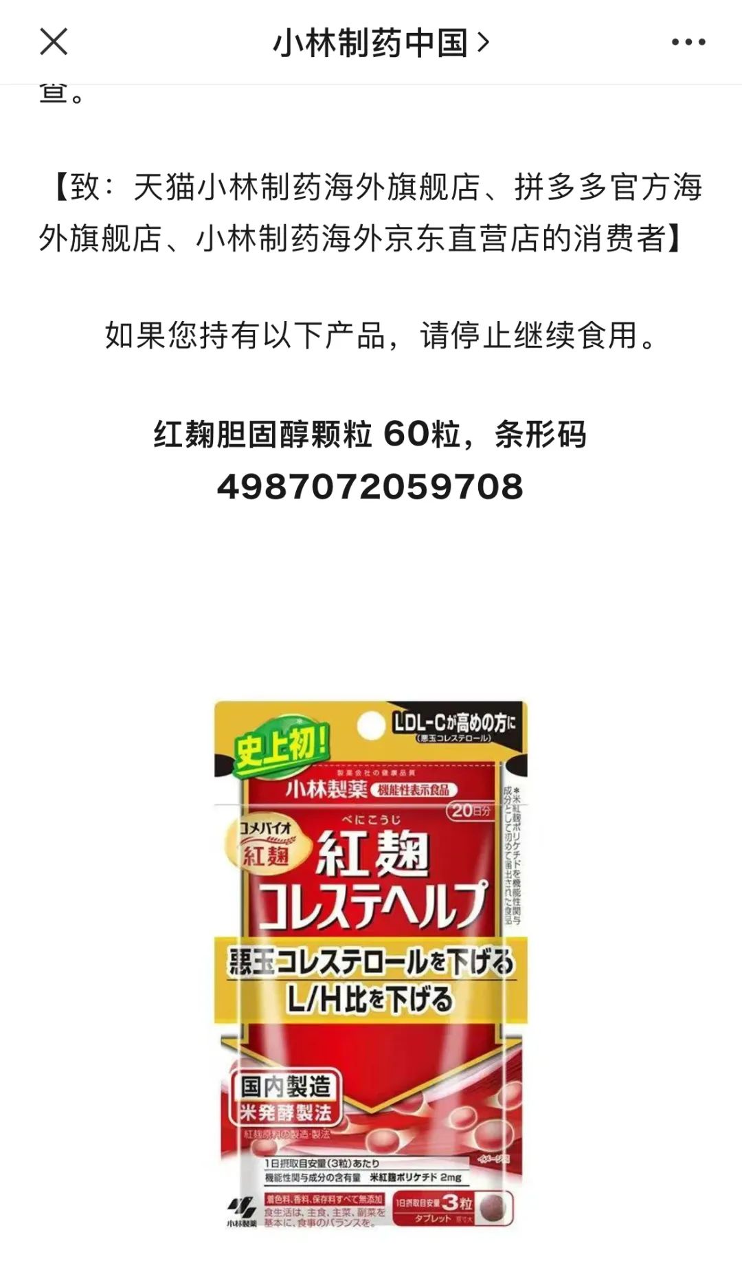 3月24日下午,小林制药中国官方微信公众号发布《关于停止使用红麹胆固醇颗粒及自主召回的通知》。此前,小林制药社长也已就相关问题召开记者会并致歉。