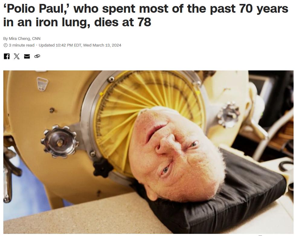 保罗·亚历山大(Paul Alexander)是一名脊髓灰质炎幸存者。70多年来,他的生命维系于一台名叫“铁肺”的金属桶。当地时间3月11日,保罗病逝,享年78岁。