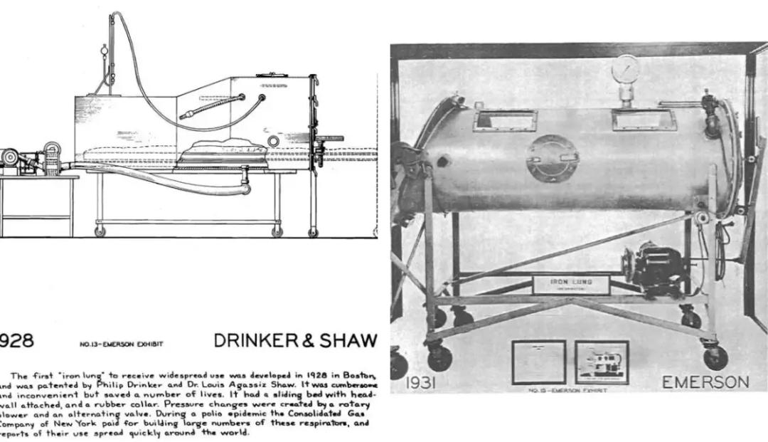 从左到右,分别是Drinker呼吸机设计图和约翰·海文·艾默生铁肺原型。图片来源The Evolution of Iron Lungs