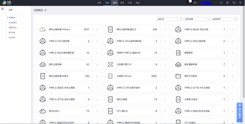 “中粮E云”实现对信创资源池、VMware资源池、公有云资源池的统一纳管。现已实现对主流公有云厂商阿里云,华为云和腾讯云的统一纳管。通过用户角色权限管控实现对不同资源的统一在线申请和开通,实现集团与专业化公司的分权分域管理,既保证了各专业化公司使用的便捷性,同时也对各类资源的使用进行了统一管控。