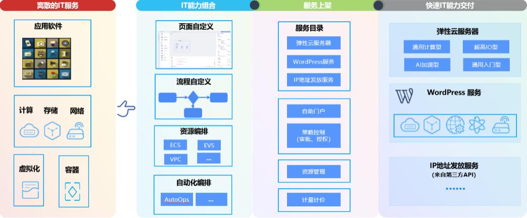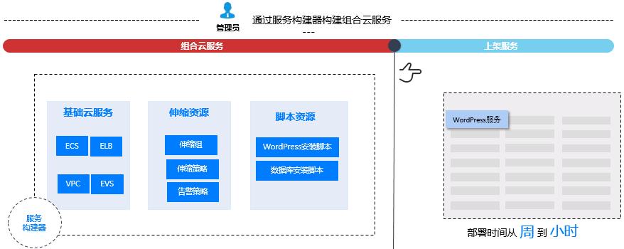 通过服务构建器将各云服务原子化的能力构建成组合服务,提供一键式自动部署能力,提升资源发放和业务上线效率。