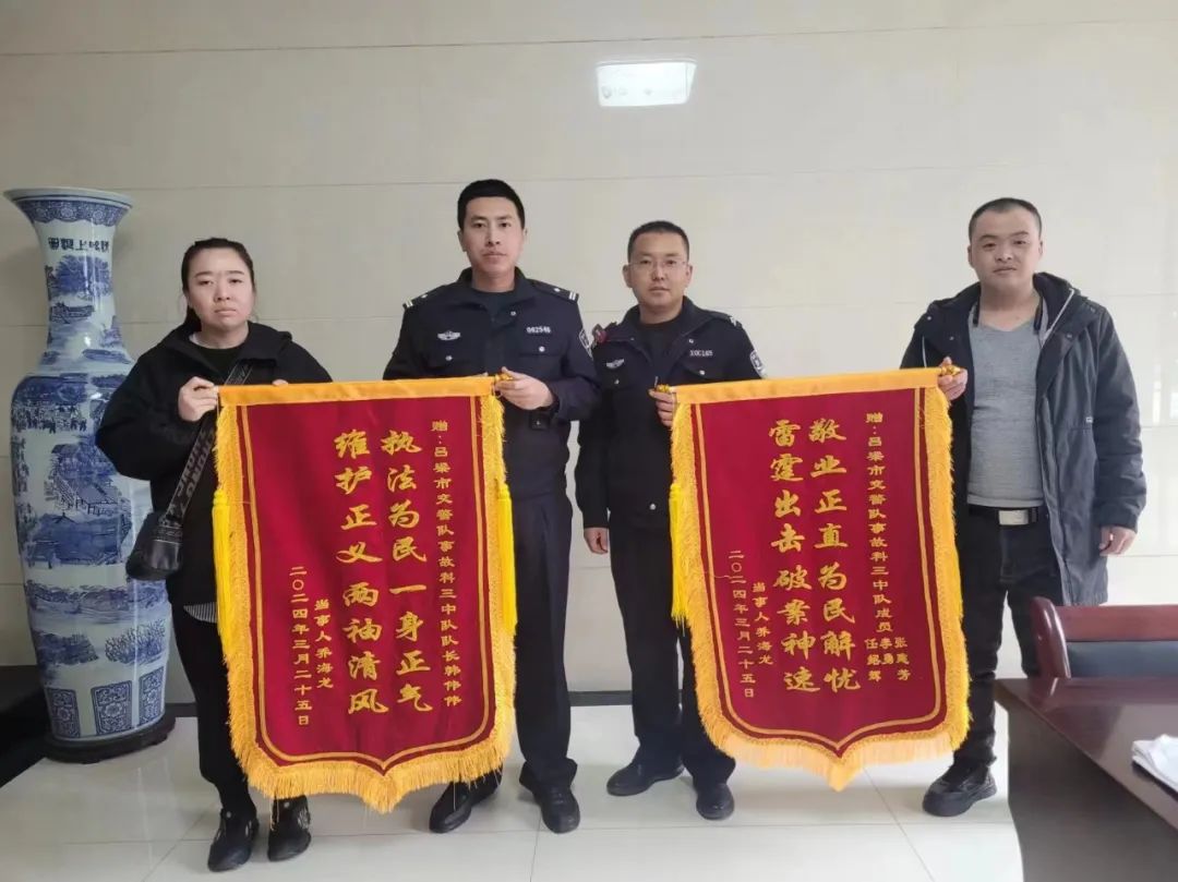 对“3.13交通肇事逃逸案”的侦破,受害人乔某龙的家属甚是感激,于2024年3月25日,将两面分别写有“执法为民一身正气、维护正义两袖清风”、“敬业正直为民解忧、雷霆出击破案神速”的锦旗送到了事故大队民警手中。