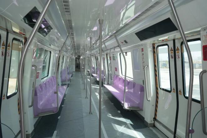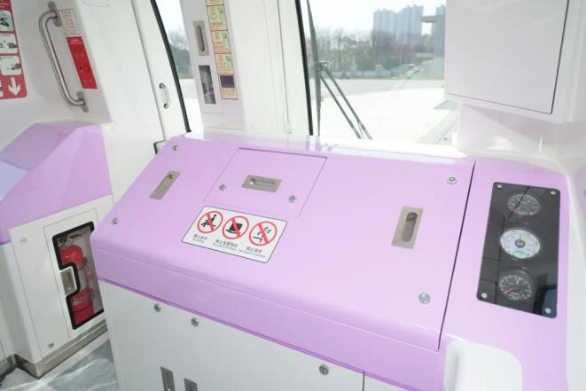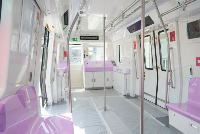 走进车厢, 浪漫迷人的樱花紫座椅映入眼帘, 地面上还铺着一层保护膜,车门上方的动态地图显示屏更大了,由38寸增大到43寸,最亮眼的是车头前方的驾驶室,是开放式的,没有司机,左侧还增加了一个应急门,乘客可以直接来到这里,看到前方的信号和区间隧道,体验一回当地铁司机的感觉!期不期待?