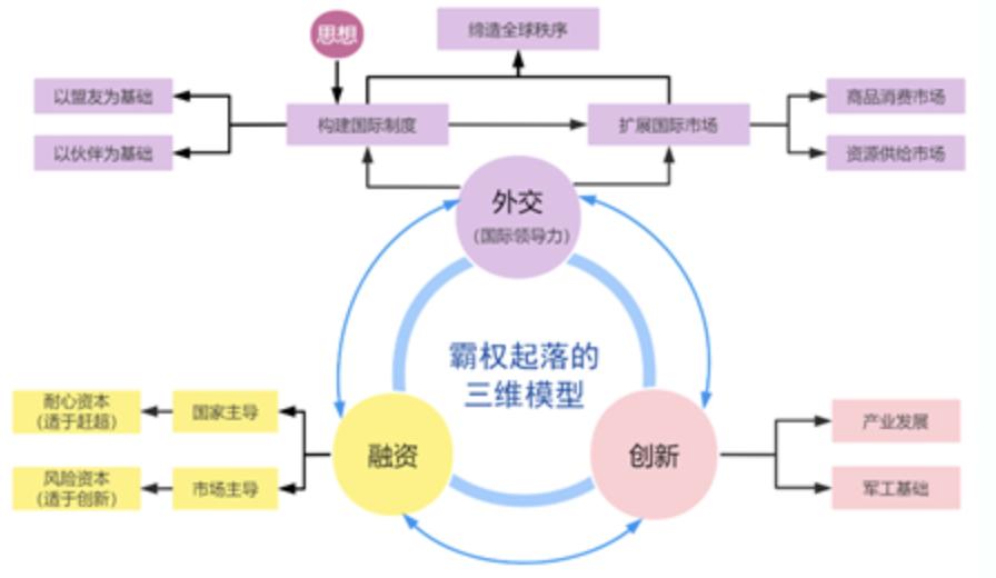 这三者之间的关系并非完全独立,而是相互影响。其中,融资能力是技术创新能力的重要保障;而技术创新能力给融资能力提供重要的信誉和信心基础。同时,霸权国需要通过国内制度建设和国际外交活动,努力促成创新能力和融资能力的良性“化学反应”。