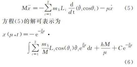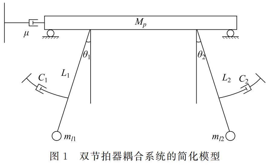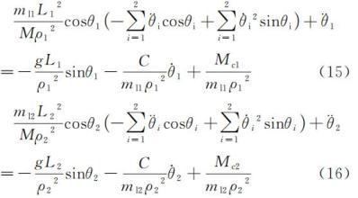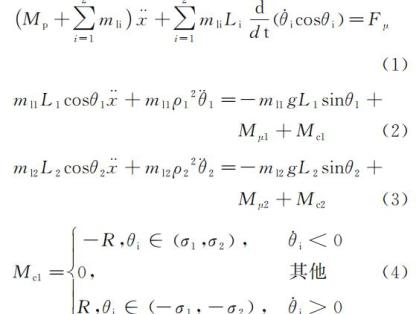 其中, mli 为第i个摆杆的质量,Mp 为平板和双节拍器底座的质量,Lli 为第 i 个摆杆质心到悬挂点的距离,θi 为第 i 个摆杆与铅垂线的夹角,ρi为回转半径,σ1和σ2为驱动力矩的摆角范围,Mci为第 i 个节拍器的擒纵机构对摆杆施加的驱动力矩。其中 Mμi为第i个摆杆受到的阻尼力矩,Fμ为地面对木板产生的摩擦力,Ii 为第i个摆杆的转动惯量,其分别为形式为