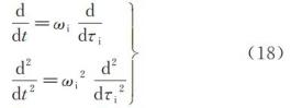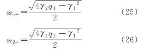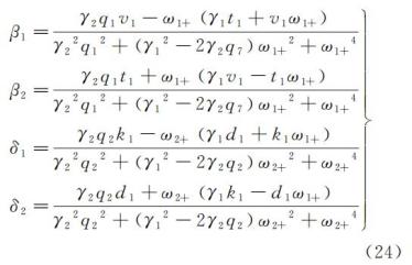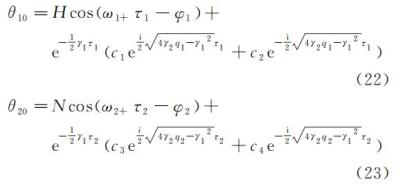 其中 vi,ti,kj,dj 为傅里叶系数,ω1+,ω2+ 为摆杆摆角圆频率。为简化分析,主要考虑 i=j=1 的驱动力函数作用,此时,式(19)(20)的通解为