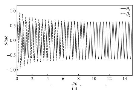 通过数值分析得到的摆角随时间演化曲线可观察系统达到同步状态的过程以及获得同步振动周期和振幅等参量。当系统处于稳定同步状态时,可认为同步后的摆角演化曲线上连续两个峰的峰值所对应的时间差作为一个周期。为更精确地量度同步周期,可在曲线上随机取三个不同位置处的峰值对应时间差分别表示为T1,T2,T3,取这三个时间差的平均值作为数值计算的同步周期,即