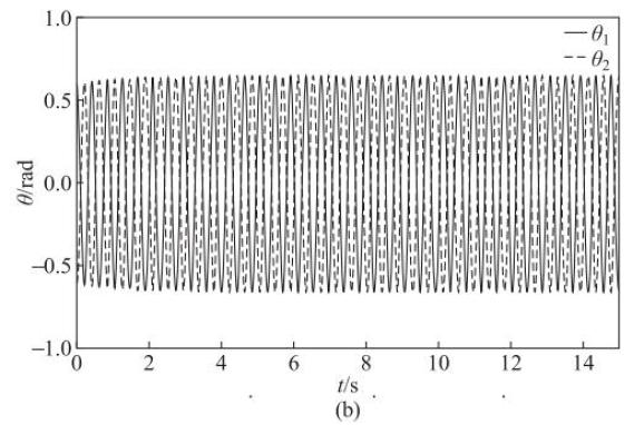 本节通过四阶龙格库塔法对双节拍器耦合同步方程组(1)~(3)进行数值分析,双节拍器耦合系统的动力学方程中系数设为MP=1kg,mli=0.1kg,ρl=18mm,Ll=7.5mm,g=9.98m/s2,σ2=0.2rad,σ1=0.1rad, Ci=3.0×10-5N·m·s/rad,μ=1.0×10-3N·s/m,R=3.5N·mm。