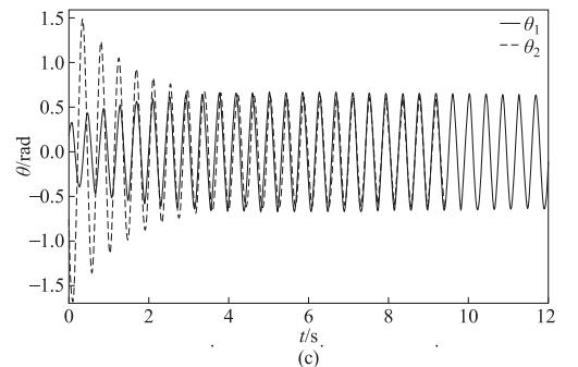 (a)θ1(0)=0.8rad,θ1(0)=0.2rad/s,θ2(0)=0.3rad,θ2(0)=-15rad/s;(b) θ1(0)=0.6rad,1(0)=0rad/s,θ2(0)=-0.6rad,θ2(0)=0rad/s;(c) θ1(0)=0.2rad,θ1(0)=4rad/s,θ2(0)=-0.8rad,θ2(0)=-20rad/s