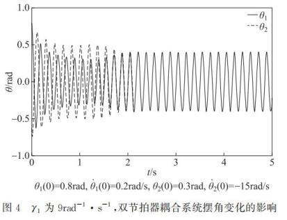 随着系统的演化,一个摆杆不断通过平板质心运动影响着另一个摆杆的摆动,同时也受到另一个摆杆的摆动影响,经过多次弱耦合作用后,节拍器最终可达到同相(或反相或延迟)同步状态,此时两摆杆摆角的差值趋于定值。数值分析结果表明:无论在哪种同步状态下,系统的摆动周期保持不变。图 2 给出了不同的初始条件情形下两摆角的同步演化规律,发现达到同步所需要的时间与初始条件密切相关;在耦合过程中,摆杆摆角的变化具有正弦函数变化特征;同相同步时,摆杆摆动振幅约为 0.69rad,摆动周期约为 0.416s,并且反相同步时也能保持相同振幅和周期,因此,同步后摆杆振幅和周期只与系统参数有关,与初始条件无关。两摆杆摆角的相位差如图 3 所示,表现为先增大后减小并最终稳定为幅值为 0.007rad、周期为 0.416s 微小扰动变化,此时系统处于同步状态,摆角的相位差值最终的变化周期与摆角的同步周期几乎一致,因此可以以摆角的差值的稳定来判断系统是否达到同步。比较图 2(a)与图 4 发现,当 γ1 值从 0.857rad-1·s-1增大至 9rad-1·s-1时,系统达到同步所需的时间从大约 9s 变为约 3s,摆杆的摆动振幅变化更快,这与近似理论关系式(22)和式(23)预测结果一致。