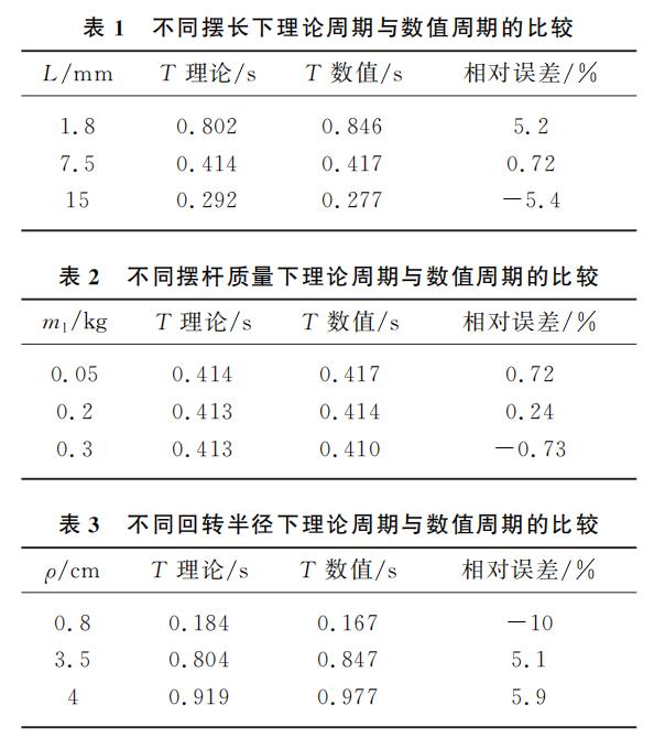 时,摆杆的同步周期与回转半径成正比。令同步系数 q1=q2=1,即在实现同步后对摆角取线性近似,则通过控制变量法,改变其中一个系统参数,比较不同摆长、摆杆质量、回转半径下同步周期的近似理论值与数值解, 如表 1~表 3 所示。对比发现,在给定的同步系数下,部分摆长对同步周期的理论值与数值解之间的相对误差影响较大,当摆长从2mm 变化到 15mm 时,同步周期减小,相对误差值有正有负,因此,近似理论值和数值解之间的差异不具备一致性(表1)。当摆杆质量从 0.05kg 变化到 0.3kg 时,同步周期无论是理论值还是数值解,差异小于 0.007s,若以 0.41s作为偏移基准,则偏移量小于 1%,因此,我们可以认为摆杆质量对同步周期的影响不大(表2)。从回转半径分析结果看(表3),近似理论中,回转半径与同步周期近似成正比关系,这与式(29)的分析一致。因此,通过不同摆长、摆杆质量和回转半径的同步周期理论值与数值解的结果比较,发现式(28)给出的近似理论式能够较好地反映同步周期的变化特征。对于表 1~3 中部分摆杆同步周期的理论值与数值值二者间的差异过大,我们认为主要与 q 值的选取有关。
