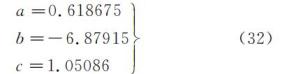 其中,a,b,c 为待定参数。取摆杆的摆长从 2~70mm 不等间隔变化,质量从 0.05~0.6kg 不等间隔变化,回转半径从 4~50mm不等间隔变化,其他系统参数为MP=1kg,g=9.98m/s2,σ2=0.2rad,σ1=0.1rad,μ=1.0×10-3N·s/m,Ci=3.0×10-5N·m·s/rad, R=3.5N·mm 时,通过数值解确定 γ12 和 γ2,然后通过数值分析得到同步周期,进而得到q值。通过一系列的 γ12、γ2 和 q 值对拟合函数(31)进行数值分析, 从而可得待定参数 a,b,c 的取值为