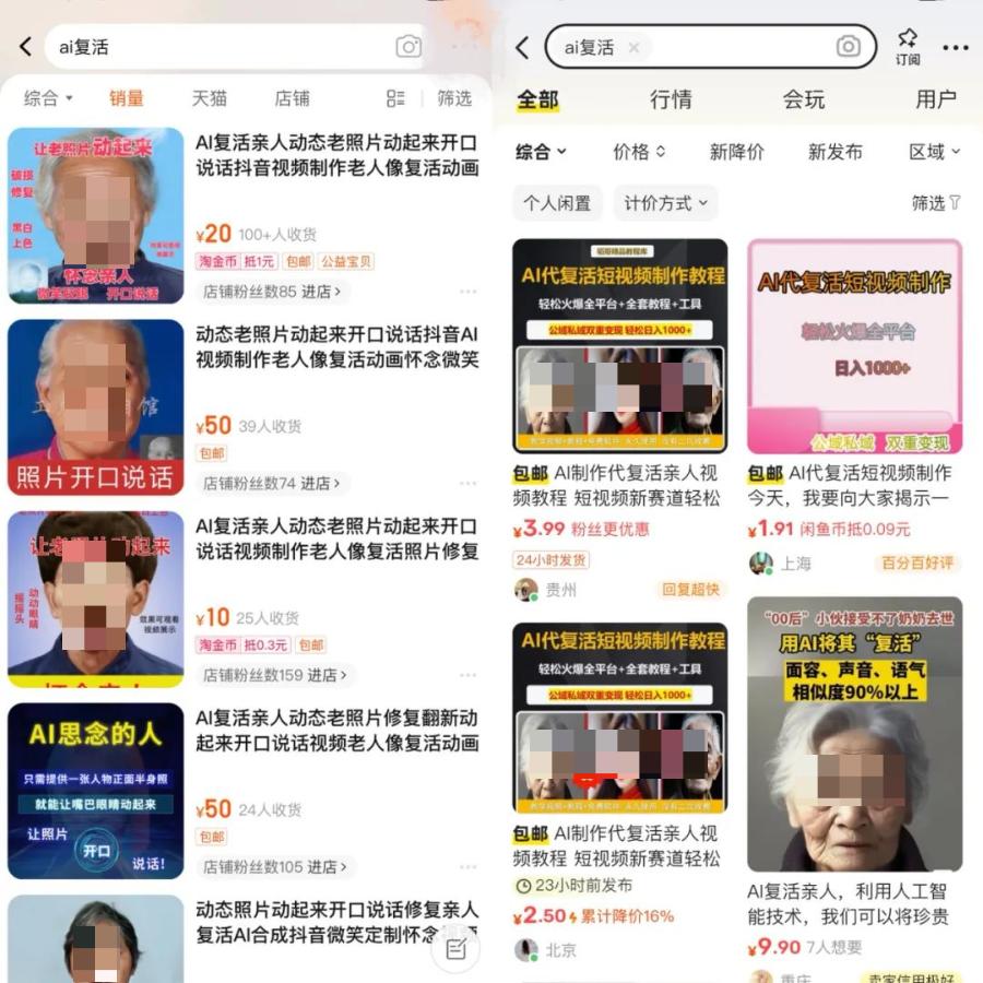 “只需提供一张人物正面照,就能让嘴巴、眼睛和头部动起来……”记者在一些电商平台搜索“AI复活”,发现已有不少相关付费服务,有些已售出超过100单,价格从10元至数万元不等。