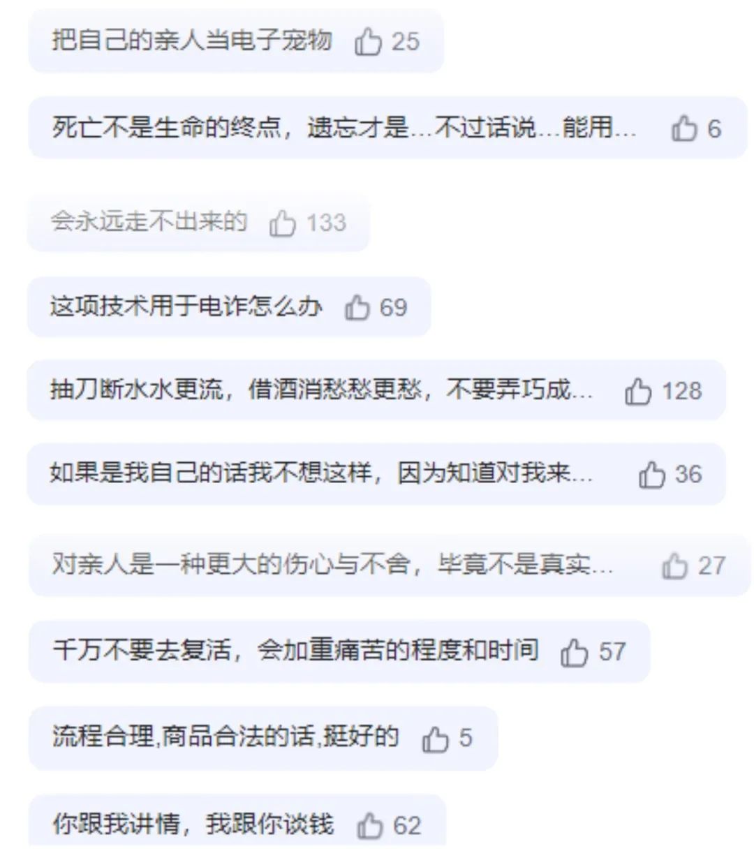 对此,有人欣然接受,认为这项技术为人们提供了情感慰藉的新途径,“看到了逝去多年的亲人,真是泪流满面”“对家人很有意义”;但也有人表示担忧,“逝者已去,沉湎于虚拟交流怎么往前走”“我怕所谓的‘复活’只是黄粱一梦”。