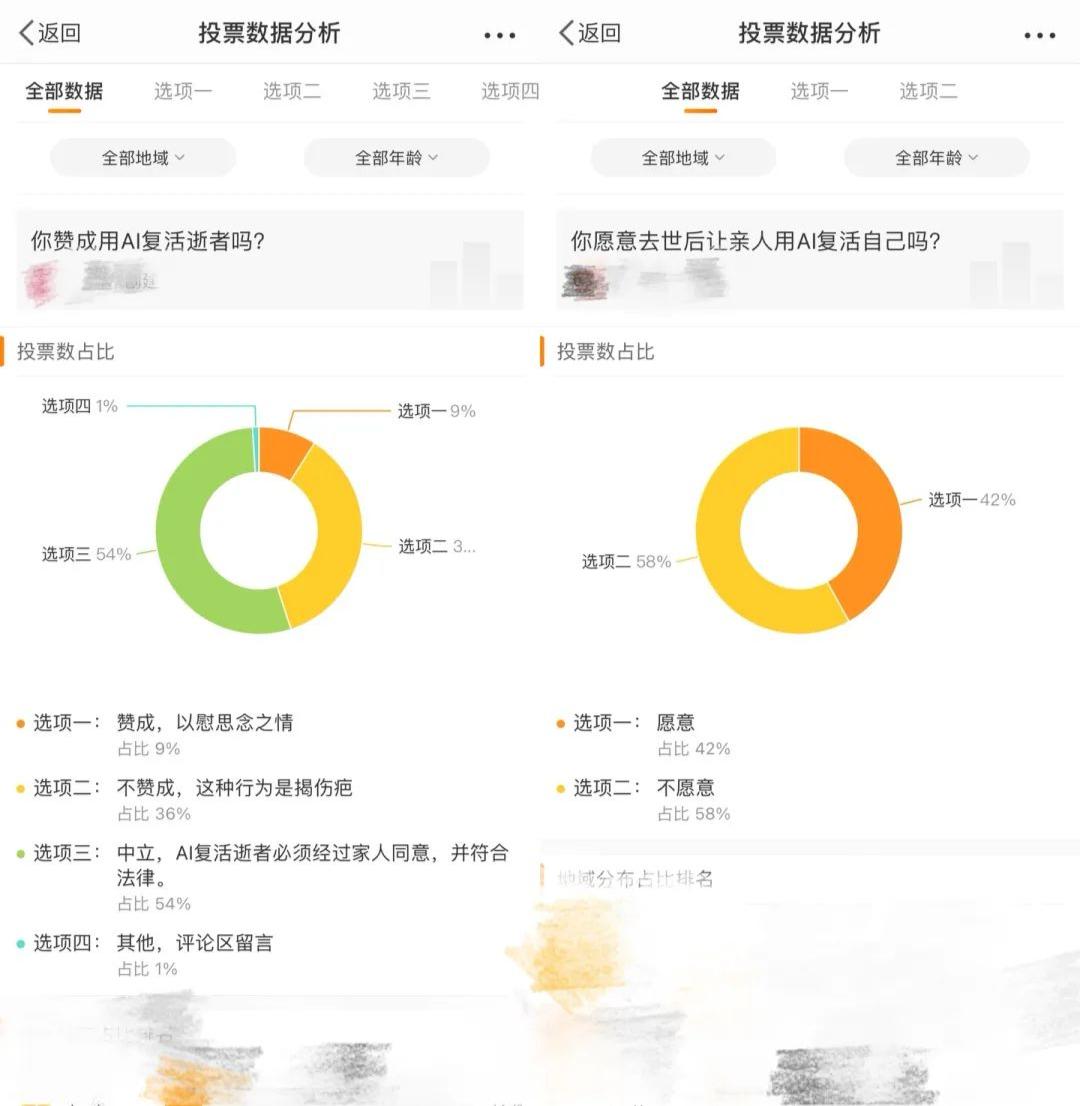 近日,两项关于“复活”和“被复活”的问卷调查中,大众的观点存在差别。在“你赞成用AI复活逝者吗”的投票中,9%的人表示接受,36%的人表示反对,其余人持保留意见;而在另一项“你愿意去世后让亲人用AI复活自己吗”的投票中,58%的人表示不愿意,42%的人表示接受。