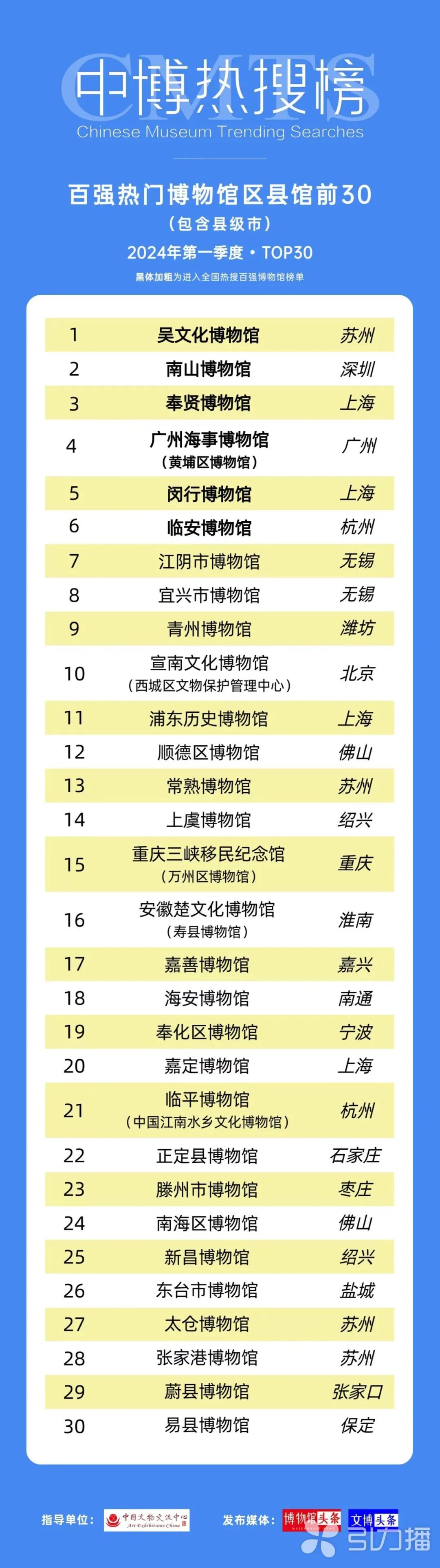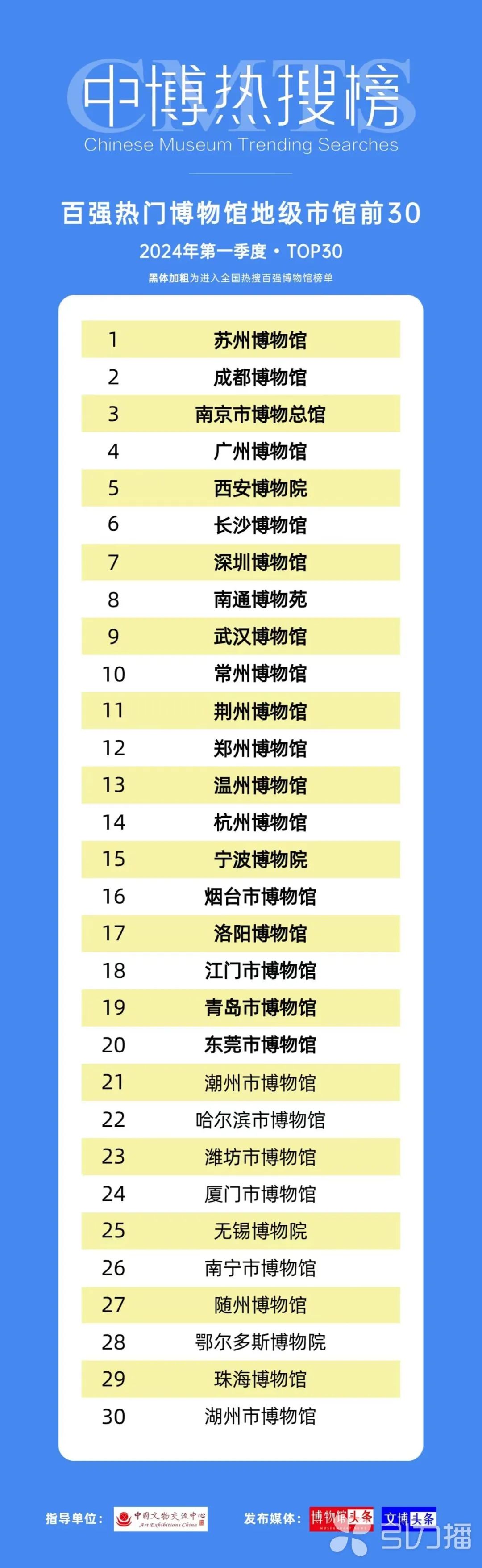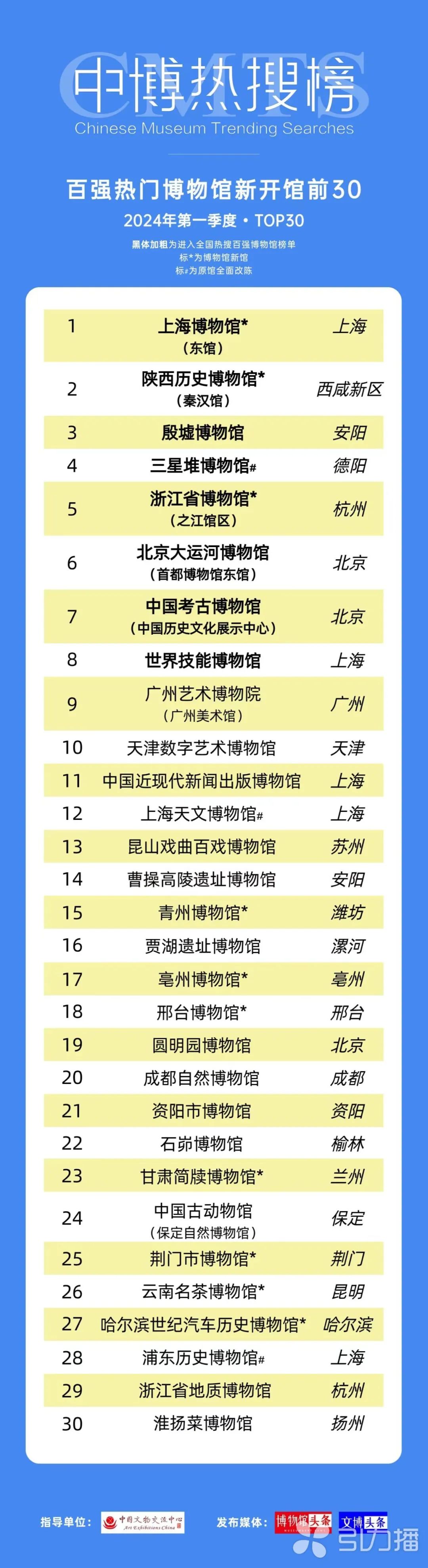 与全国热门百强博物馆榜单一同发布的,还有2024年第一季度“百强热门博物馆地级市馆前30”“百强热门博物馆区县馆前30”“百强热门博物馆专题馆前30”“百强热门博物馆自然科学类馆前30”“百强热门博物馆新开馆前30”,这些榜单均为首次发布。