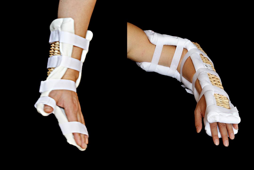 支具以钢丝做框架,以杞柳编织做支撑板,按人体自然曲线弯曲成适合人体各部位的角度及弧度,内敷棉布,并缀以紧固用尼龙搭扣固定,可以包裹住人体大部分躯干,适用范围比小夹板更为广泛,多用于非经移骨折、内固定手术后,颈部、肢体等部位的外固定,以及软组织损伤的外固定。具有透气性好、可调节、轻便舒适的特点,临床使用可看清使用者的血管,防止血栓形成,病人痛苦小,疗效好,费用少,周期短。