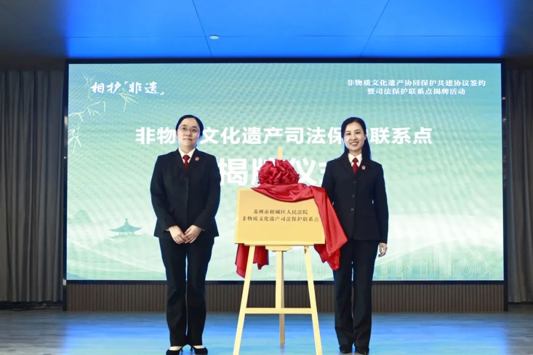 活动中,相城区人民法院党组书记、院长俞水娟,苏州知识产权法庭庭长赵晓青共同为“非物质文化遗产司法保护联系点”揭牌。