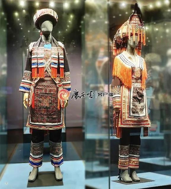 广西民族博物馆展出的贺州瑶族男服、女服。