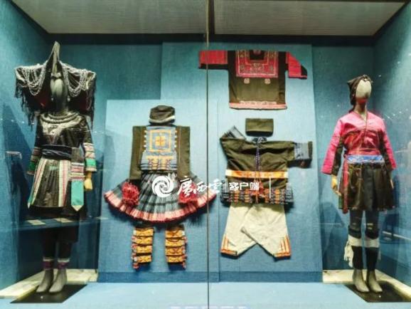 广西民族博物馆展出的瑶族服饰。下排从左到右分别为:融水瑶族女服、南丹瑶族女服、南丹瑶族男服、龙胜瑶族女服。