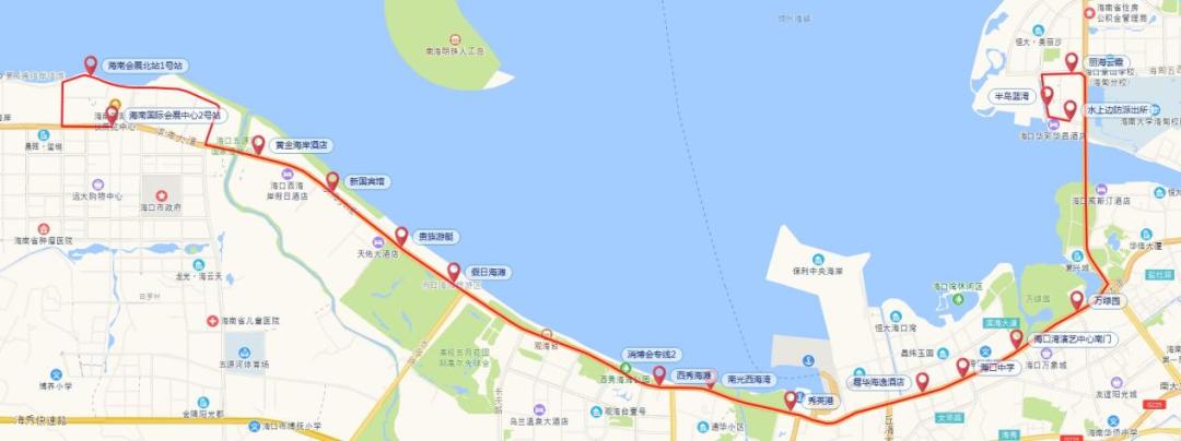 返程➡海南国际会展中心2号站(最外侧通道)、浪琴湾、黄金海岸酒店、新国宾馆、贵族游艇、假日海滩、西秀海滩、南光西海湾、秀英港、君华海逸酒店、海航国际广场、海口湾演艺中心南门、万绿园、美丽沙花园、半岛蓝湾、水上边防派出所。
