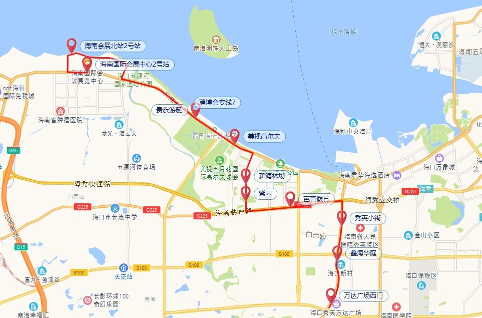返程➡海南国际会展中心2号站(中间通道)、贵族游艇、美视高尔夫、新海林场、紫园、芭普假日、海玻市场、鑫海华庭、万达广场西门