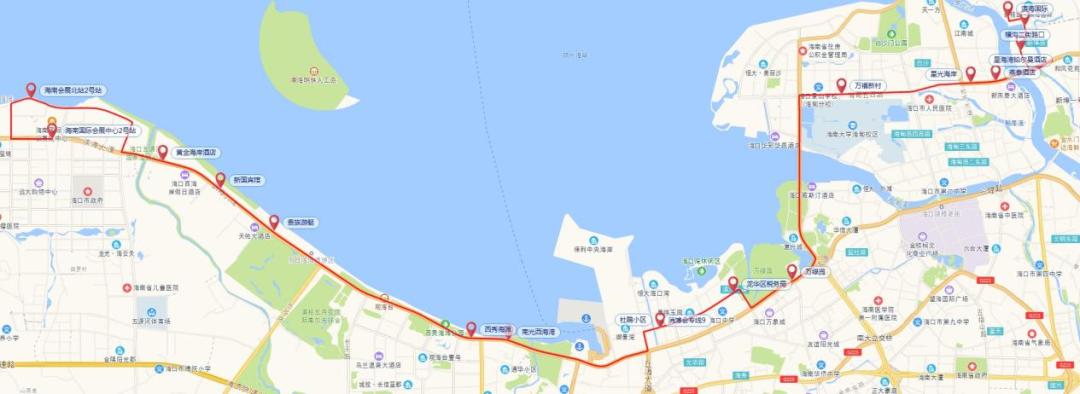 往程➡水上边防派出所、半岛蓝湾、丽海云霞、万绿园、海口湾演艺中心南门、海口中学、君华海逸酒店、秀英港、南光西海湾、西秀海滩、假日海滩、贵族游艇、新国宾馆、黄金海岸酒店、海南会展北站1号站