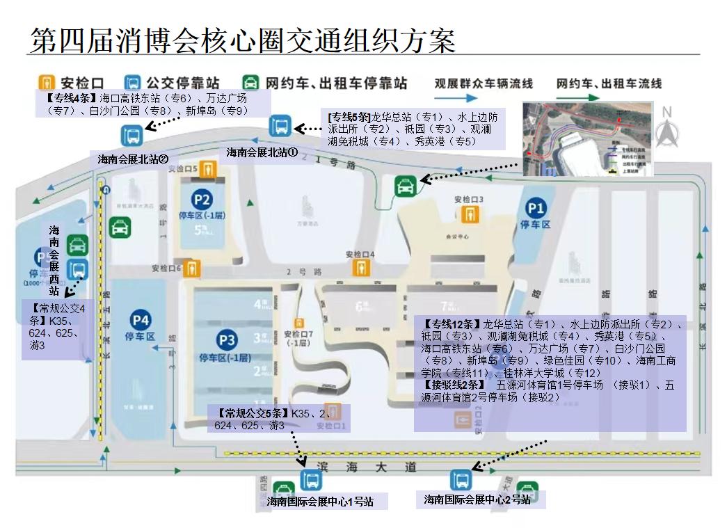 消博会期间,展会周边设置海南会展北站1号站、海南会展北站2号站、海南会展西站、海南国际会展中心1号站、海南国际会展中心2号站等5个公交站点和1个出租车上落客区域(海南国际会展中心北广场)。届时,海口交投集团将安排工作人员及志愿者驻点值守,疏导乘车秩序、应急处置和提供问询服务。