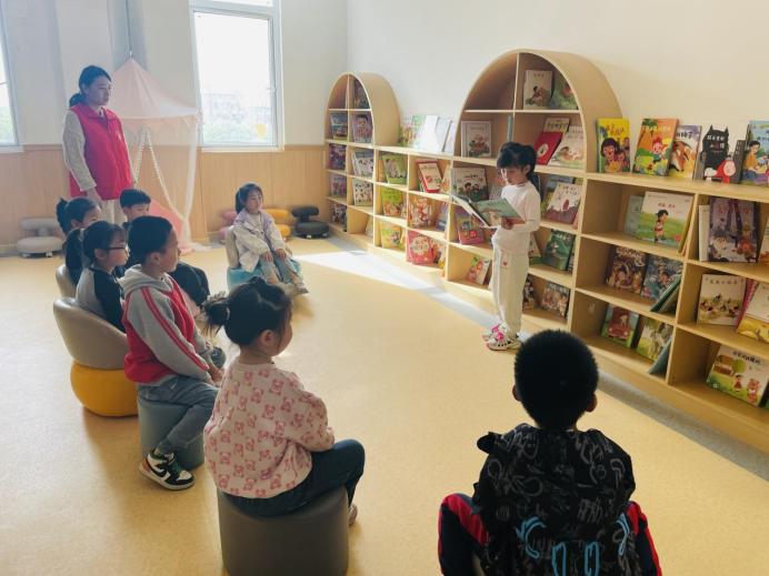 社区书吧里,面对琳琅满目的书籍和绘本,小朋友们开心地挑选着自己喜欢的绘本。简单的文字配上生动的插图,有趣的故事情节,孩子们畅游在书的海洋中。不一会儿,就有三名小朋友主动站在台前跟大家分享自己喜欢的故事。“我喜欢和同学们讲一讲我爱看的绘本,我想把我喜欢的故事和图画与我的朋友们分享。”大班小朋友们纷纷表示。