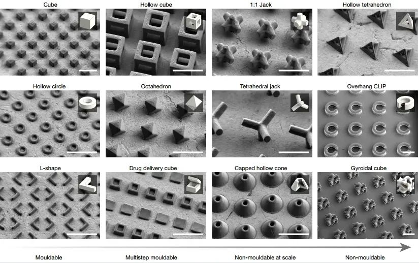 图3 r2rCLIP制造的可模塑和不可模塑形状的SEM图像(比例尺,250µm)