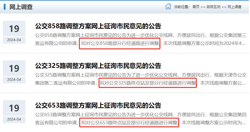 注意:858路线路调整方案公示时间为2024年4月17日至2024年4月23日。653路、325路线路调整方案公示时间为2024年4月19日至2023年4月25日。