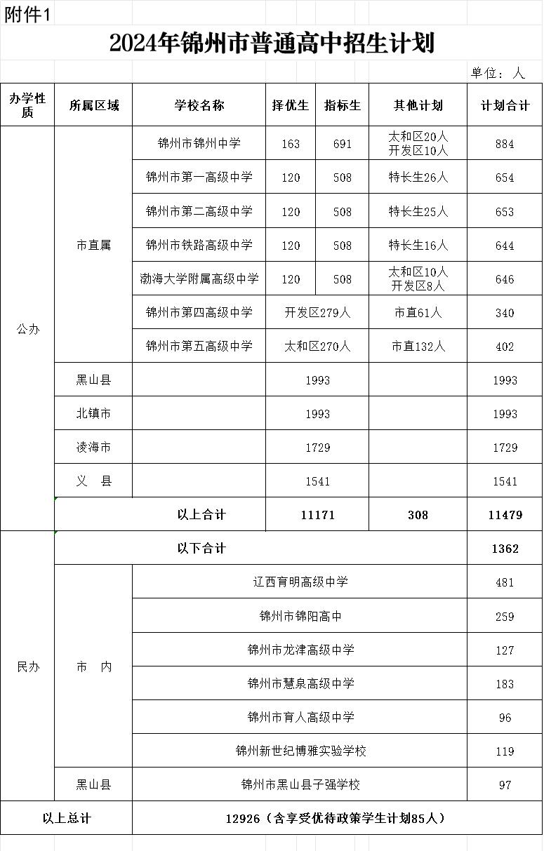 我市公布2024年高中阶段教育招生计划。2024年全市高中阶段计划招生20406人。普通高中计划招生12926人,其中公办高中计划招生11479人(市直属高中4223人,县域高中7256人),民办高中计划招生1362人(市内1265人,黑山县97人),享受优待政策学生计划85人。中等职业教育学校计划招生7480人(含往届生源和外省市生源计划)。