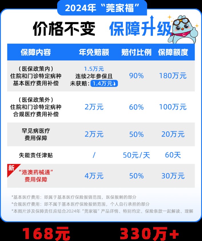 2024年“莞家福”在保持价格不变、延续惠民的基础上,优待连续参保人、调整责任五保障责任,将惠民进行到底:优化基本医保政策内补充待遇保障,责任一保障金额由150万提升至180万;针对23、24年连续参保且未获赔的参保人,责任一起付线由1.5万下调至1.4万;责任五调整为“港澳药械通”责任保障,让“莞家福”参保人也能用上港澳地区上市的新药特药。