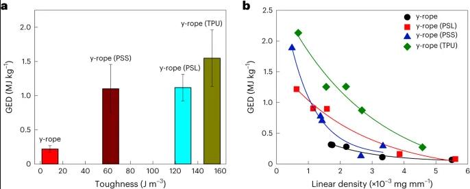 图 3:GED 与 y 型绳索的韧性和线密度的函数关系