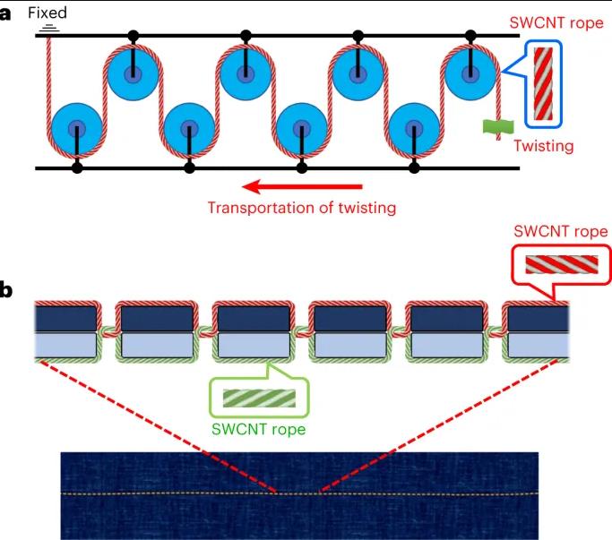 研究表明,扭曲的SWCNT绳能够可逆地存储能量,其能量存储密度超过锂离子电池三倍,展现出纳米机械能量存储的潜力。通过复合滑轮系统或使用缝纫机,可以设计出高度紧凑且高效的SWCNT绳能量存储系统,实现大量能量的紧凑存储。尽管长SWCNT绳面临能量存储容量下降的挑战,但结合改进的SWCNT纺丝技术,特别是使用TPU等热塑性弹性体,提供了改善的可能性,为实现更大规模能量存储开辟了道路。